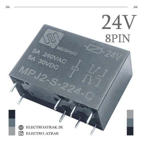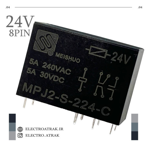 رله 24 ولت دو کنتاکت کتابی 5 آمپر 8 پین MPJ2-S-224-C برند MEISHUO