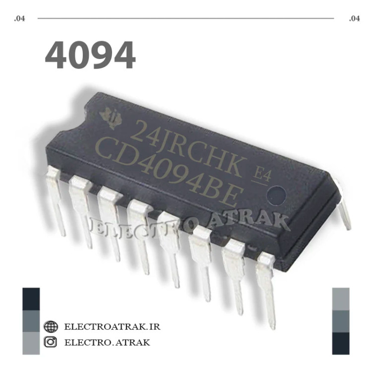 آیسی CD4094 یک شیفت رجیستر 8 بیتی با خروجیهای سه حالته و قابلیت ذخیرهسازی است. این آیسی شامل یک رجیستر شیفت سریالی 8 بیتی، یک استیج ذخیرهسازی 3 حالته (Tristate) و منطق کنترل برای ورودی داده سریالی (Serial Input)، فعالسازی خروجی (Output Enable) و کنترل خروجی سه حالته است. CD4094 به عنوان یک مبدل سریال به موازی (Serial-to-Parallel Converter) استفاده میشود و برای افزایش تعداد خروجیهای یک سیستم دیجیتال با حداقل استفاده از پینهای میکروکنترلر یا سایر آیسیها بسیار مفید است.