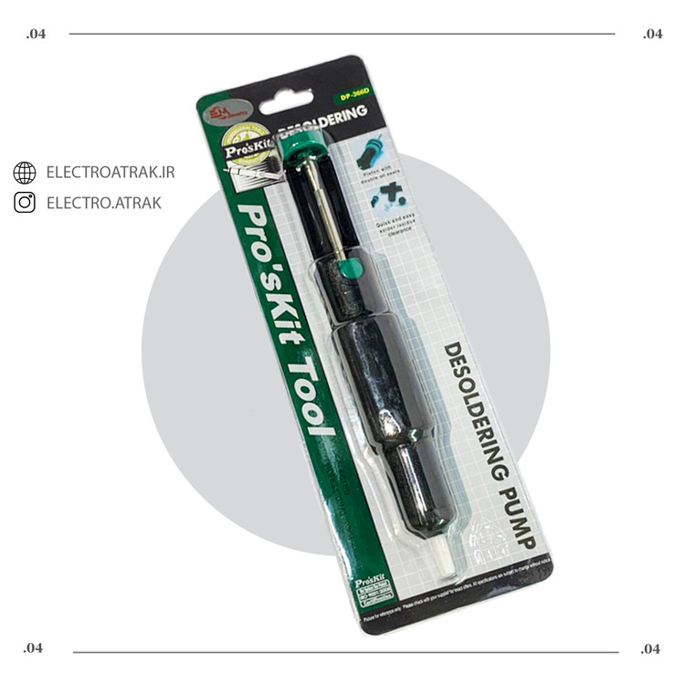 قلع کش مدل dp-366d پروسکیت تایوان یک قلع کش با بدنه پلاستیکی است ، دارای قدرت مکش بالا (قدرت مکش 30cm-HG می باشد) و نوک یک تکه نسوز می باشد. این محصول ساخت تایوان و از مرغوبیت بالایی برخوردتر است.