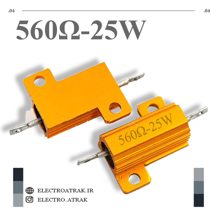 مقاومت فلزی 560 اهم ۲۵وات یک عنصر الکترونیکی دوپایه است که مطابق قانون اهم هنگامی که جریان الکتریکی از آن عبور کند بین پایه هایش اختلاف ولتاژ ایجاد میشود و بمنظور کم نمودن و تقسیم ولتاژ و جریان مورد استفاده قرار میگیرد .