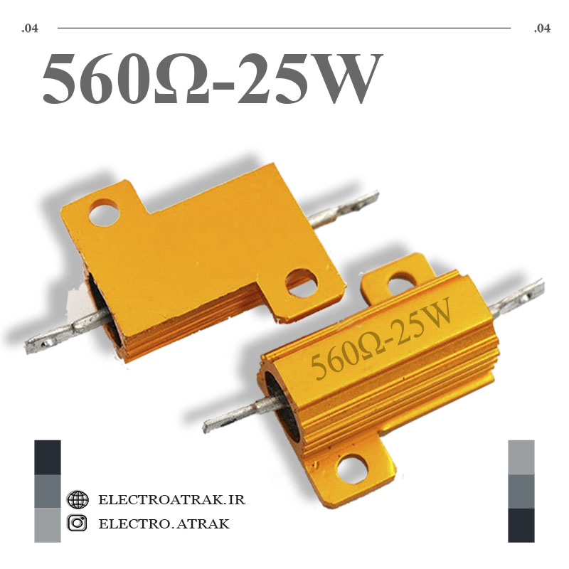مقاومت فلزی 560 اهم ۲۵وات یک عنصر الکترونیکی دوپایه است که مطابق قانون اهم هنگامی که جریان الکتریکی از آن عبور کند بین پایه هایش اختلاف ولتاژ ایجاد میشود و بمنظور کم نمودن و تقسیم ولتاژ و جریان مورد استفاده قرار میگیرد .