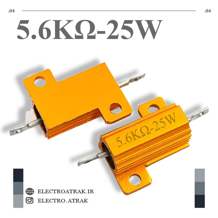 مقاومت فلزی 5.6 کیلو اهم ۲۵وات یک عنصر الکترونیکی دوپایه است که مطابق قانون اهم هنگامی که جریان الکتریکی از آن عبور کند بین پایه هایش اختلاف ولتاژ ایجاد میشود و بمنظور کم نمودن و تقسیم ولتاژ و جریان مورد استفاده قرار میگیرد .