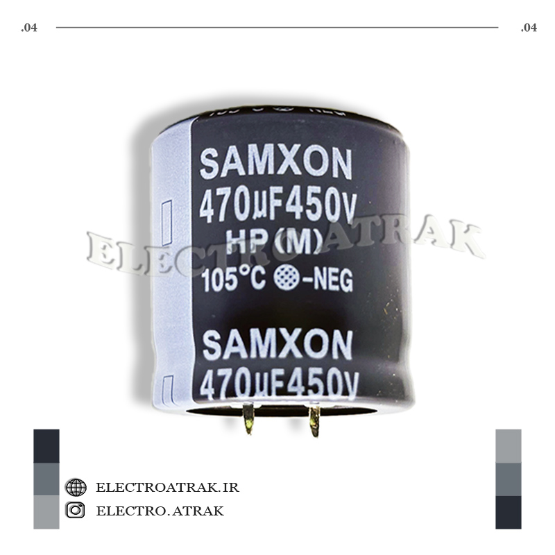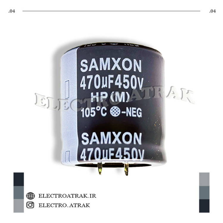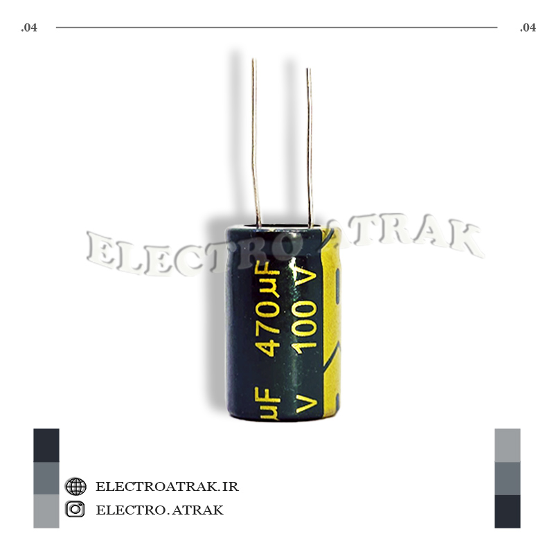 این خازن با ظرفیت 470 میکروفاراد و در ولتاژ های 6.3 ولت ، 10 ولت ، 16 ولت ، 25 ولت ، 35 ولت ،50 ولت ، 63 ولت ، 100 ولت ، 200 ولت ، 250 ولت ، 400 ولت ، 450 ولت نوع الکترولیت آلومینیومی، برای استفاده در مدارهای الکترونیکی مختلف مانند مدارهای صوتی، فیلترها و منبع تغذیه ایدهآل است.