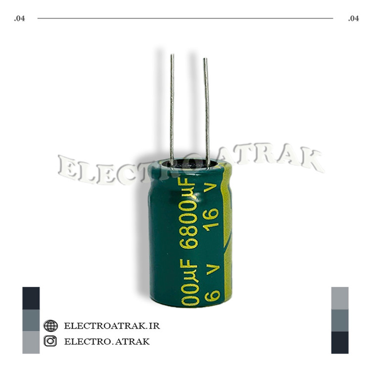 این خازن با ظرفیت 6800 میکروفاراد و در ولتاژ های 6.3 ولت ، 10 ولت ، 16 ولت ، 25 ولت ، 35 ولت ،50 ولت ، 63 ولت ، 100 ولت ، 200 ولت ، 250 ولت ، 400 ولت ، 450 ولت نوع الکترولیت آلومینیومی، برای استفاده در مدارهای الکترونیکی مختلف مانند مدارهای صوتی، فیلترها و منبع تغذیه ایدهآل است.