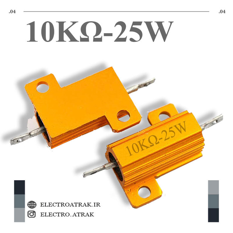 مقاومت فلزی 10کیلو اهم ۲۵وات یک عنصر الکترونیکی دوپایه است که مطابق قانون اهم هنگامی که جریان الکتریکی از آن عبور کند بین پایه هایش اختلاف ولتاژ ایجاد میشود و بمنظور کم نمودن و تقسیم ولتاژ و جریان مورد استفاده قرار میگیرد .
