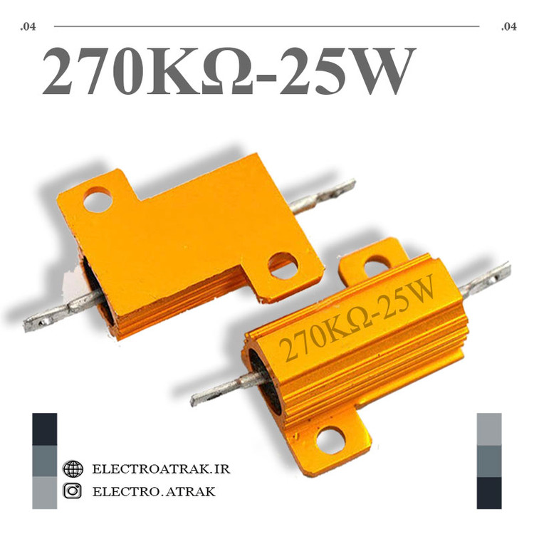 مقاومت فلزی 270کیلو اهم ۲۵وات یک عنصر الکترونیکی دوپایه است که مطابق قانون اهم هنگامی که جریان الکتریکی از آن عبور کند بین پایه هایش اختلاف ولتاژ ایجاد میشود و بمنظور کم نمودن و تقسیم ولتاژ و جریان مورد استفاده قرار میگیرد .