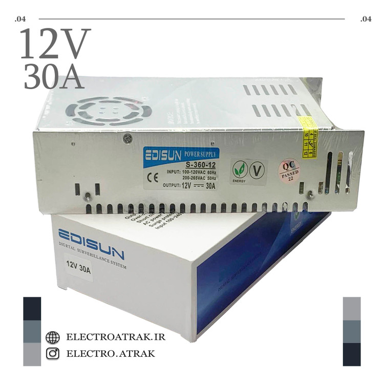 منبع تغذیه سوئیچینگ ادیسون با توان 12 وات و جریان 30 آمپر، انتخابی فوقالعاده برای تامین انرژی تجهیزات الکترونیکی با نیاز بالای جریان است. این منبع تغذیه با ولتاژ ورودی برق شهری و ولتاژ خروجی 12 ولت، برای پروژههای روشنایی و الکترونیکی طراحی شده است.